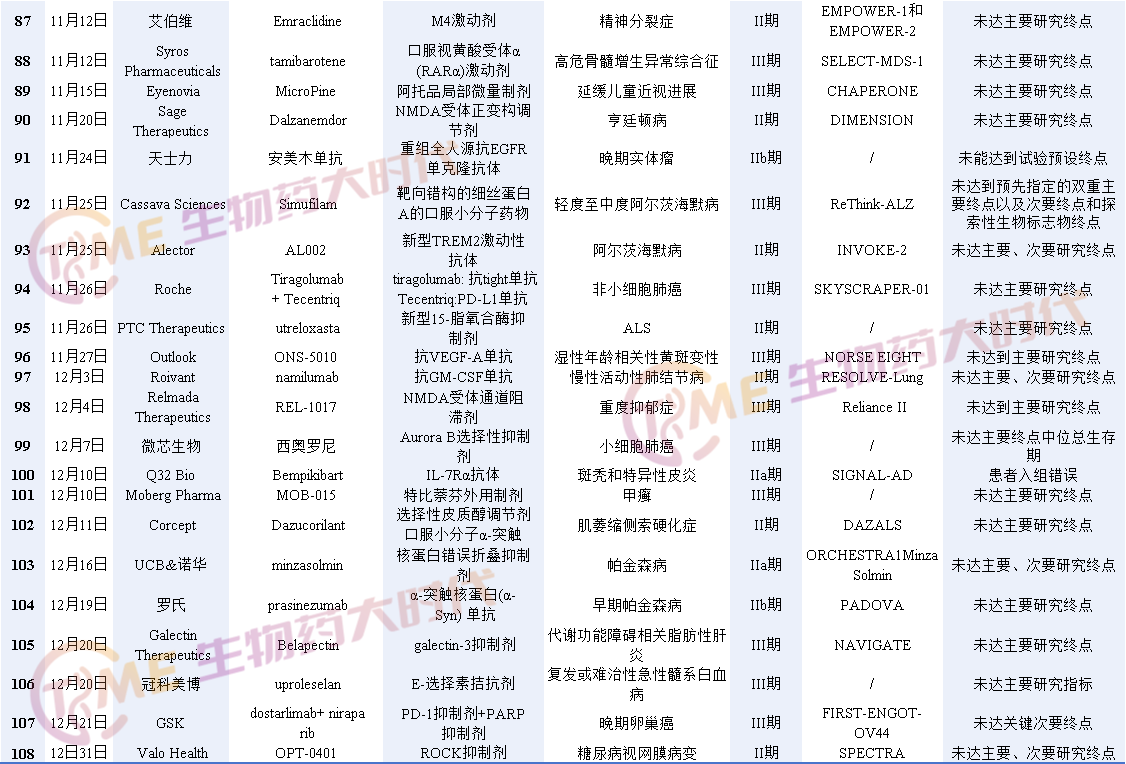 · 12月16日,UCB宣布,与诺华合作开发的 minzasolmin(一种研究性口服小分子 α-突触核蛋白错误折叠抑制剂)的 ORCHESTRA 帕金森病概念验证研究未达到其主要和次要临床终点。