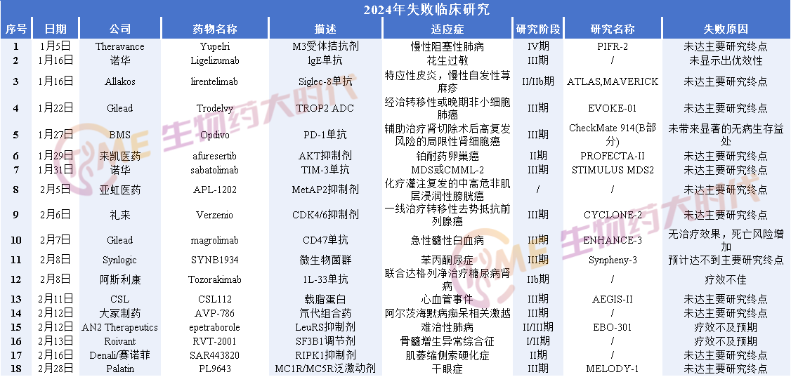 2024年,全球医药研发领域经历了一系列令人瞩目的临床试验失败事件,这些失败不仅揭示了新药研发过程的复杂性和挑战,也促使制药企业重新审视其研发策略和临床试验设计。从慢性阻塞性肺病药物到帕金森病治疗药物,从肿瘤免疫疗法到基因疗法,多个领域的临床研究在历经长时间和大量资源投入后,未能达到其主要终点或关键次要终点。