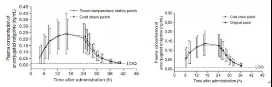 罗替高汀用了大概4年时间重回市场,新的透皮贴剂处方(在常温下稳定的贴片),人体BE实验证明与刚上市的贴片以及“冷链贴片”生物等效(图4)。Neupro于2012年获FDA和EMA再次批准上市,至此EMA市场上的“过渡期间片剂”-冷链贴片完全被替换。2018年中国批准进口,销售市场前景好。重回市场,归来还是那个“少年”。