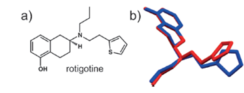 图2 a) 罗替高汀的化学分子式;b) 罗替高汀两种构象,红色是Form I的构象;蓝色是Form II的构象
