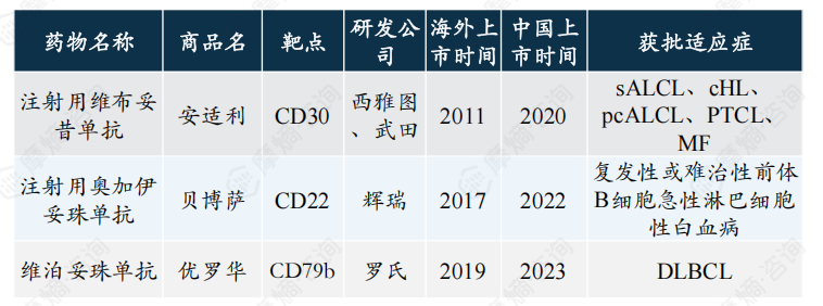 (3)抗体偶联药物:如CD79b、CD30抗体偶联MMAE(报告中相应章节有具体产品介绍)