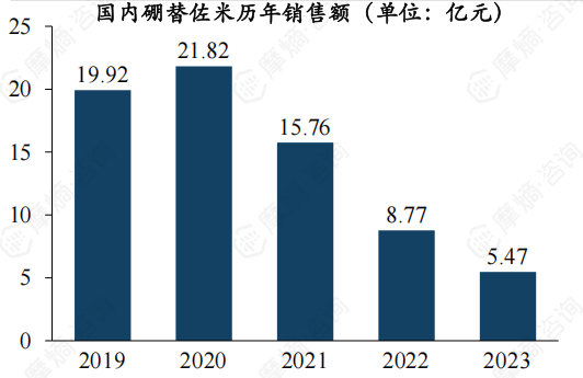 从销售额情况来看,2017年纳入医保后稍有起色,2023年销售额为4.59亿元,其化合物专利 2023 年到期,目前尚无仿制药申报。