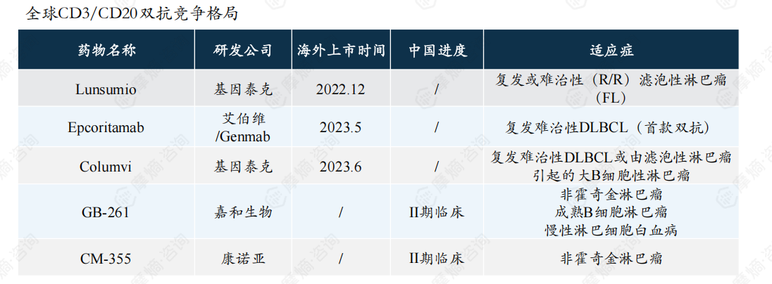 CD3-CD20双抗近两年迅猛发展,全球已有3款双抗获批上市,国内尚处于临床II期阶段