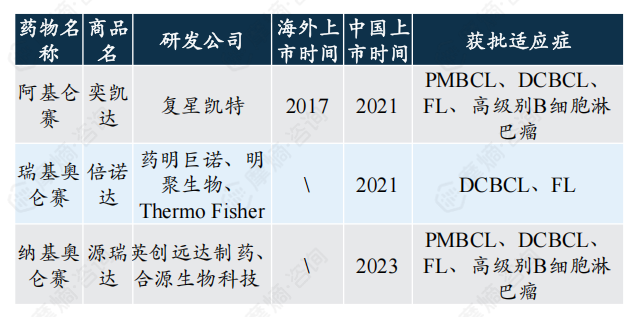 据摩熵医药数据显示,截止2024年10月,全球共计6个CD19 CAR-T细胞疗法获批上市,均用于淋巴瘤治疗,并均通过单臂关键临床获得附条件批准。国内有三款获批上市,因成本和定价均较昂贵(阿基仑赛定价为120万元/针,瑞基奥仑赛定价为129万元/针,纳基奥仑赛为99.9万元/针),且尚无纳入医保,导致放量受阻。