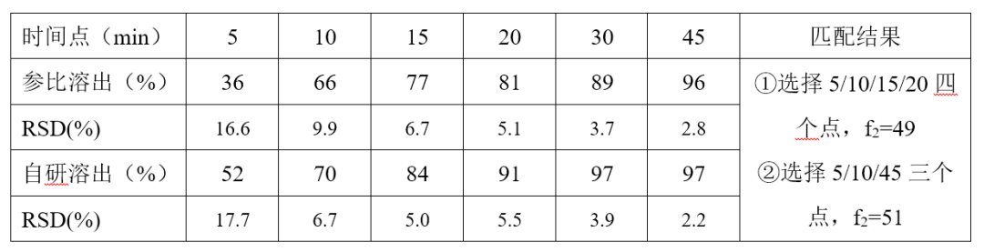 到85%以上,即案例1中选择四个时间点,则参比溶出超过85%的时间点有两个,违背了法规的规定;2.选择更多的时间点往往将参比和自研溶出的差异给拉小了,即f2增大了,如案例1本来不匹配的也变大匹配了。