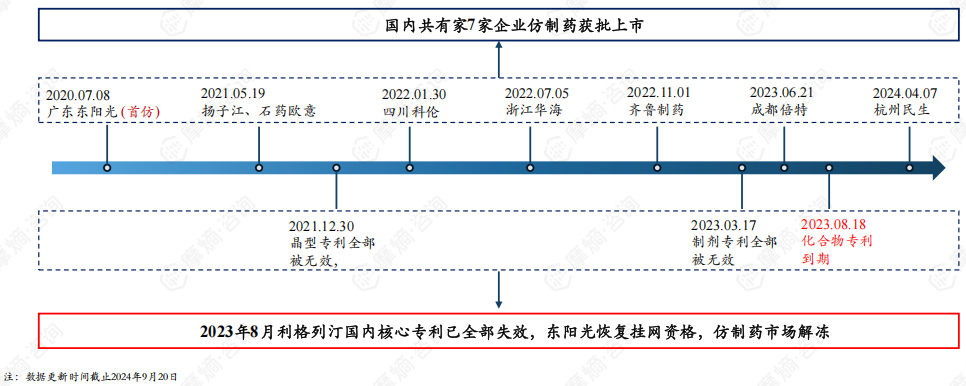 2022年8月5日,国家知识产权局发布了行政裁决结果,责令广东东阳光立即撤网停止销售。东阳光曾尝试无效利格列汀片化合物专利未成功,直到2023年8月利格列汀片国内核心专利到期,广东东阳光才获准恢复挂网销售资格,国内其他获批的仿制药企也陆续进入市场。