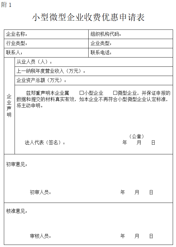 1.小型微型企业收费优惠申请表