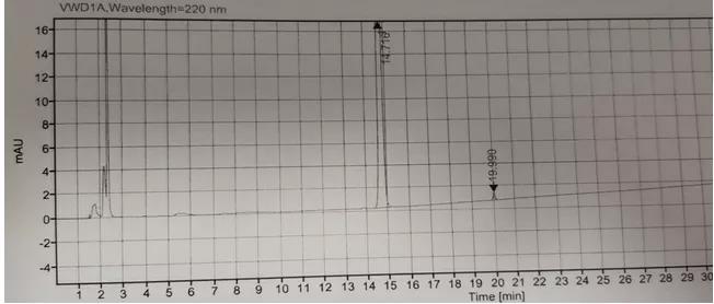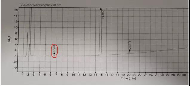 供试品溶液的制备是样品检测的关键,在转移过程中会遇到样品污染问题。转移用的样品为注射液,主成分含量低且容易污染(在转移方实验室已证明一次性塑料滴管会引入异常色谱峰;直接倒入进样小瓶也可能引起污染—接触瓶外壁导致;玻璃滴管及玻璃注射器可用;进样小瓶及瓶盖必须新开封)。然而,在接收方实验室使用玻璃滴管取样检测时,发现异常色谱峰(详见图6),故进行偏差调查。分别原样复测、原玻璃滴管取样检测,发现仍存在异常色谱峰;用一次性注射器取样检测,发现其他异常峰(详见图7);用清洗干净的玻璃注射器取样检测,未发现异常色谱峰(详见图8),结果正常。
