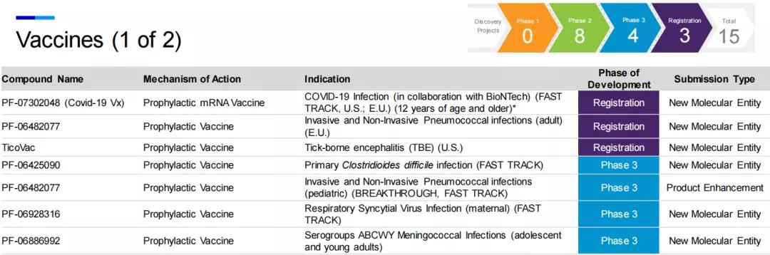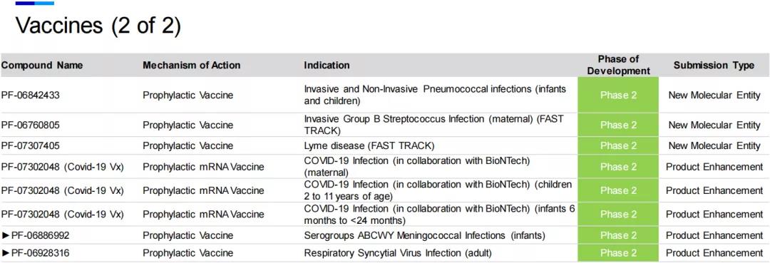 此外,辉瑞的疫苗研发领域还涉及原发性艰难梭菌感染、(成人及儿童)侵袭性和非侵袭性肺炎球菌感染、产妇呼吸道合胞病毒感染、ABCWY血清群脑膜炎球菌感染、产妇侵袭性B组链球菌感染、莱姆病和流感等适应症。