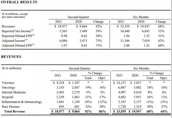 2021年7月28日,辉瑞公布2021年第二季度业绩,公司2021年第二季度总收入189.77亿美元,同比增长92%,其中,新冠疫苗BNT162b2贡献了78.38亿美元的收入。若不包含新冠疫苗BNT162b2的收入,则其余部分营收达到111.39亿美元,同比增长10%,去年同期,可比业务的同比增长率为6%。