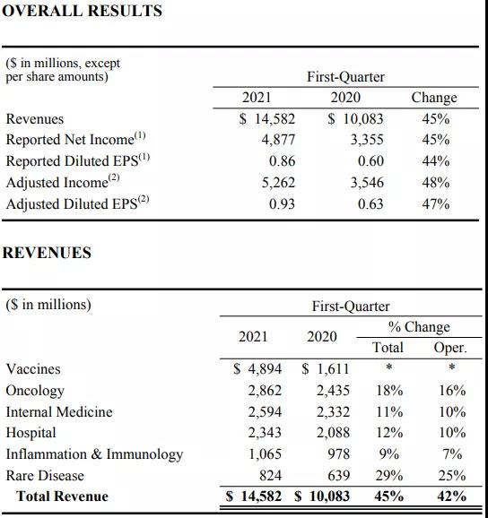 2021年5月4日,辉瑞公布2021Q1业绩,公司第一季度收入为145.8亿美元,同比增长45%,主要受到了新冠疫苗BNT162b2的推动,一季度贡献了34.62亿美元的销售收入。按治疗领域分,肿瘤药品业绩为28.62亿美元,同比增长18%;内科药品业绩为25.94亿美元,同比增长11%;医院业务收入为23.43亿美元,同比增长12%;炎症与免疫学业绩为10.65亿美元,同比增长9%;罕见病业务收入8.24亿美元,同比增长29%。
