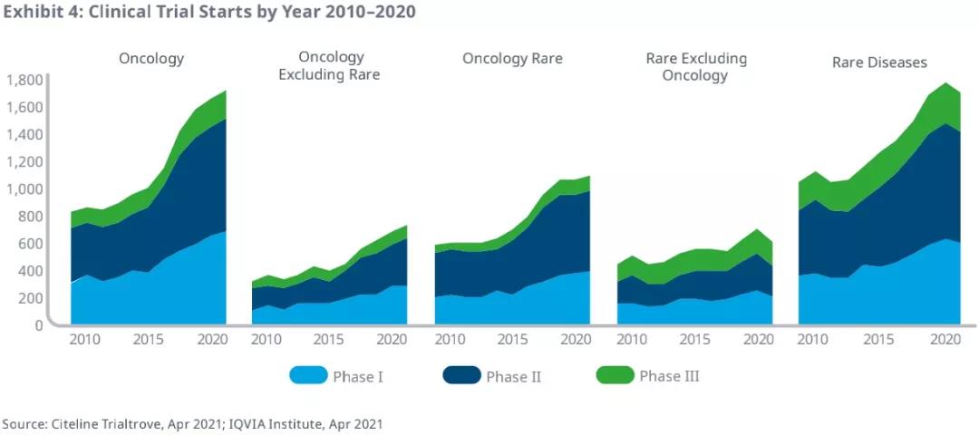 根据IQVIA研究报告,肿瘤和罕见病是近10年开展临床试验最多,增长最快的两个领域,且都未受到COVID-19太大影响。2020年,新开启的肿瘤学临床试验数量创历史新高,比2015年增长了60%,反映了这一领域的强劲增长势头。在肿瘤和罕见病重叠处的罕见肿瘤领域引人注目,2020年罕见肿瘤学临床试验占肿瘤学的63%,占罕见病的64%,这一领域在临床上看似“冷门”,但在美国,罕见病对应的“孤儿药”在研发过程中享有优先审评、7年专利保护等一系列政策支持,而成为一些企业的“必争之地”。且肿瘤领域赛道本就拥挤,研发过程漫长,而罕见肿瘤领域或许能因政策支持而获得一些优势。