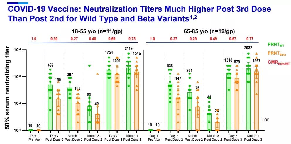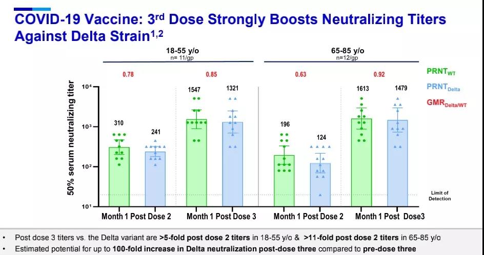 Delta变种(B.1.617.2)因其快速增殖的能力已成为全球流行的主要毒株,因而备受关注,针对Delta变种,接种第三剂BNT162b2疫苗后,中和抗体滴度在18-55岁成人中提高5倍以上,在65-80岁老年人中提高11倍以上。