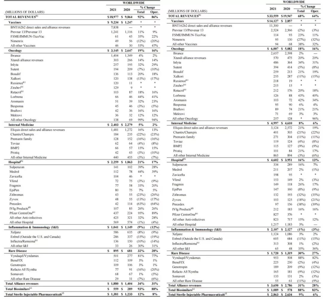 辉瑞2021年第二季度(左)&上半年(右)产品业绩