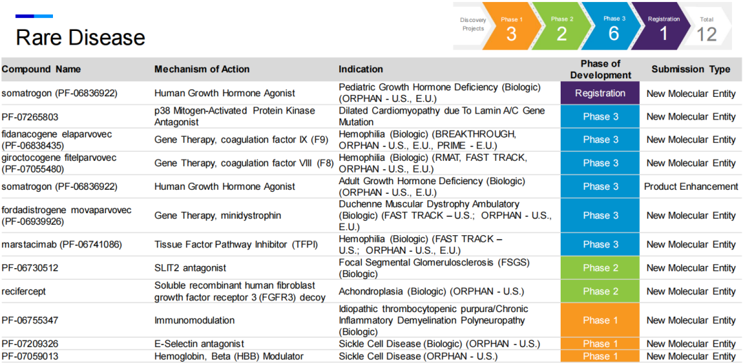 罕见病是辉瑞近年来加大布局的领域,也是公司潜在first-in-class产品最多的领域之一,包括一款创新生物制品以及三款基因疗法。