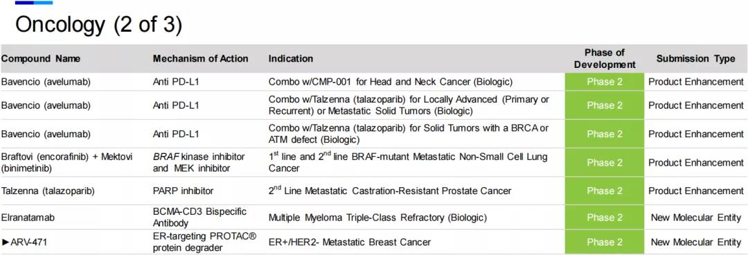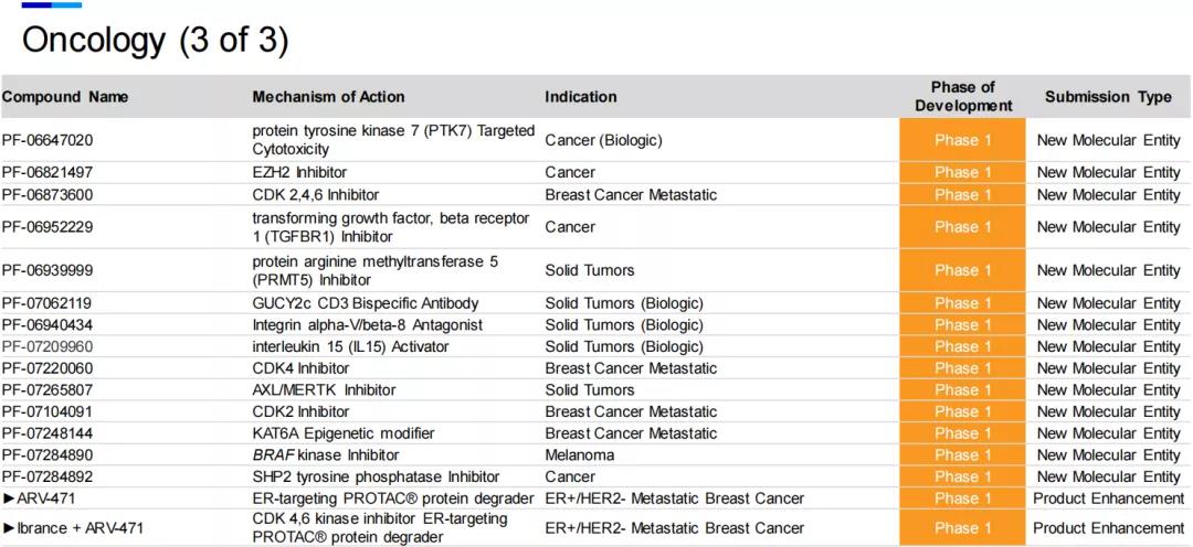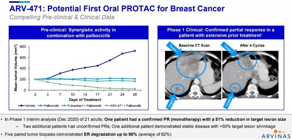 辉瑞表示,ARV-471是潜在首款治疗乳腺癌的口服PROTAC疗法。临床1期数据显示,ARV-471在先前接受过多种疗法的患者中疗效显著,且具有良好的耐受性和可控性,临床前研究显示,它与CDK4/6抑制剂Ibrance(palbociclib)联用表现出很好的协同作用。公司计划在2021年底完成1期剂量递增研究,并启动与依维莫司联用的1b期临床试验,以及治疗早期乳腺癌的2期临床试验。2022年,辉瑞和Arvinas计划完成Ibrance + ARV-471联合疗法的1b期临床试验,并计划启动多项治疗转移性乳腺癌的3期临床试验,包括与CDK4/6抑制剂Ibrance联用,并开展治疗早期乳腺癌的关键性研究。