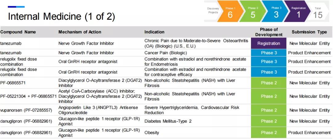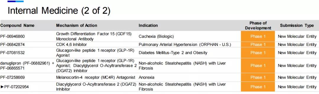 在内科药品领域中,除了上述的Danuglipron(PF-06882961)和PF-06865571,处于临床1期的还有其他5款潜在药物,涉及到的靶点与相应的适应症分别为GLP-1受体激动剂(2型糖尿病和肥胖),GDF15单抗(恶病质),CDK4/6抑制剂(肺动脉高压),MC4R拮抗剂(厌食症)等。