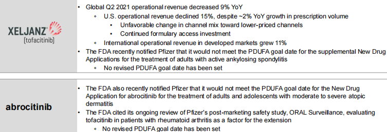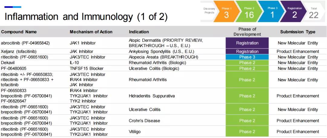 不过,两款处于后期阶段的JAK抑制剂审批遇阻,2021年1月,在一项长期的安全性研究中,XELJANZ ®(tofacitinib,托法替尼)未达到非劣的安全性终点,引起辉瑞的JAK抑制剂全领域产品接连遭受FDA审查延期,包括XELJANZ ®针对强直性脊柱炎的补充申请,以及在研口服小分子JAK 1抑制剂abrocitinib (PF-04965842)针对特应性皮炎的上市申请,该药物曾获得优先审评和突破性疗法资格,但目前PDUFA日期待定。
