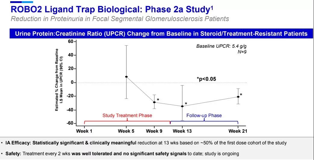局灶节段性肾小球硬化(FSGS)是一种罕见的进行性肾脏疾病,超过60%的患者在5 - 10年内进展为终末期肾脏疾病。辉瑞在研的PF-06730512是ROBO2和可结晶片段(Fc)抗体结构域的融合体,对SLIT蛋白具有拮抗作用,SLIT蛋白的异常表达可引起肾脏发育异常。该候选药物能够改善肾脏足细胞的功能,在治疗FSGS之外,还可能用于治疗其它几种和足细胞相关的蛋白尿性肾小球疾病。在2a期临床试验中,中期分析显示该药可显著降低患者尿蛋白肌酐比值(UPCR)。