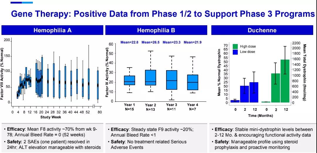 三款基因疗法(gene therapy)均处于3期临床试验,fidanacogene elaparvovec (PF-06838435)是辉瑞与合作伙伴Spark Therapeutics联合开发的B型血友病一次性治疗药物。最新数据显示,患者在接受一次治疗后第四年时仍然维持稳定的凝血因子IX活性,年出血率(ABR)<1,预计将于2022年一月获得3期临床试验结果。