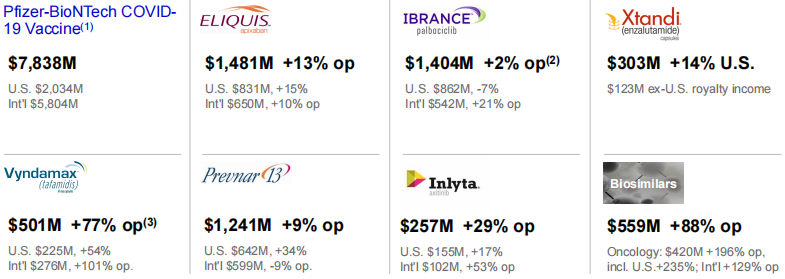 成熟创新药品成为公司的主要增长因素,口服抗凝血剂Eliquis(阿哌沙班)业绩达49.49亿美元,同比增长17%;CDK4/6抑制剂Ibrance(palbociclib,帕博西尼)业绩为53.92亿美元,同比增长9%;酪氨酸激酶抑制剂Inlyta(阿昔替尼,axitinib)业绩达7.87亿美元,同比增长65%;JAK抑制剂,口服抗炎药Xeljanz(托法替尼,tofacitinib)业绩为24.37亿美元,同比增长9%;雄激素受体(AR)抑制剂Xtandi(恩扎鲁胺,enzalutamide)业绩达10.24亿美元,同比增长22%;