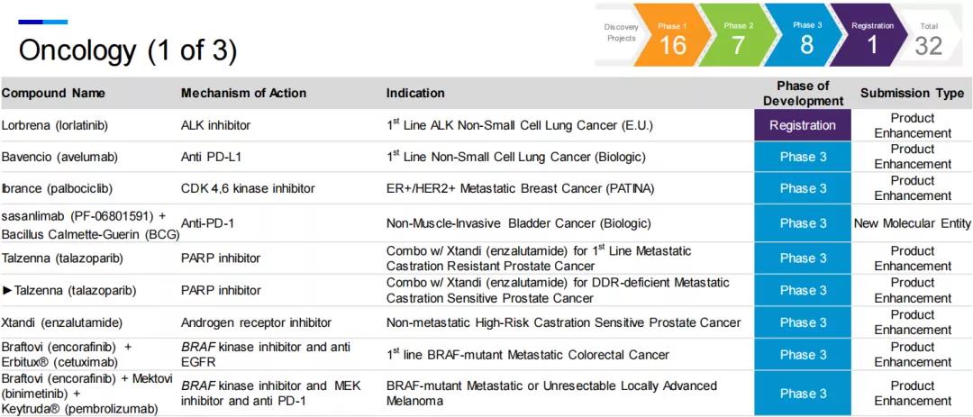 肿瘤是制药领域的热点,辉瑞在该领域共有32个项目在研,占研发项目总数的三分之一。