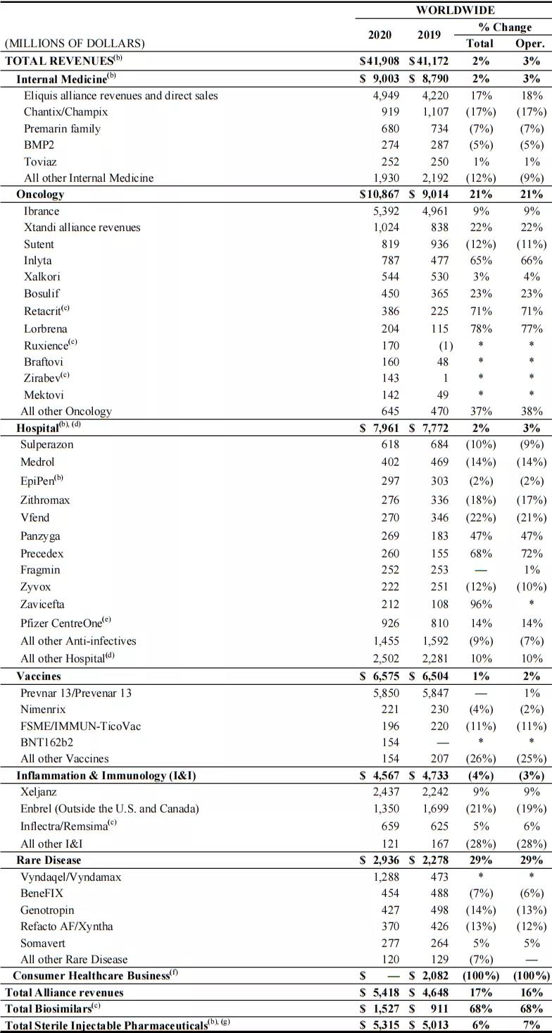 辉瑞2020年产品业绩