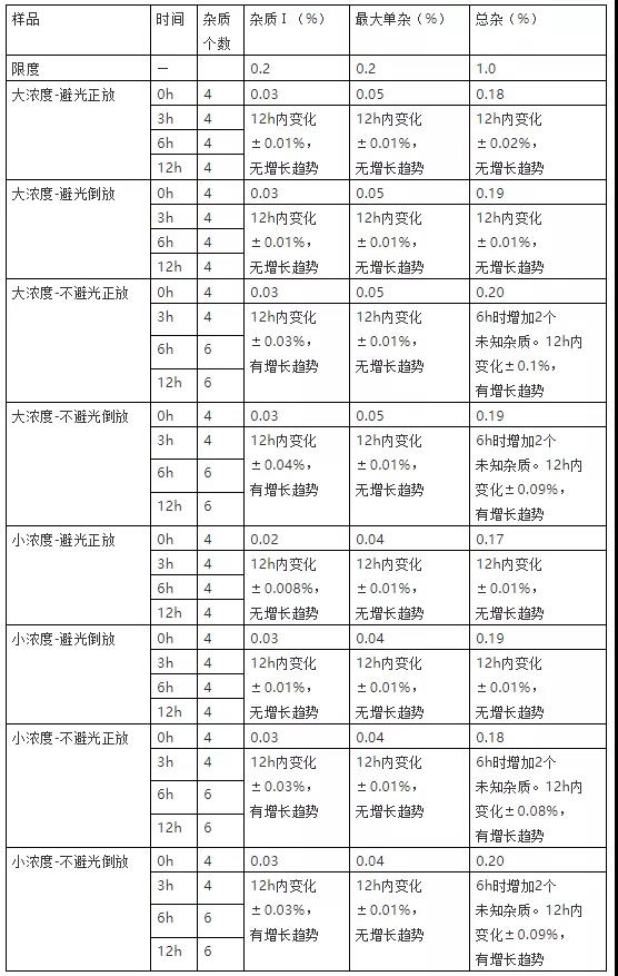 性状、pH和渗透压小结:大浓度和小浓度的不避光正倒放均在6h有杂质的增长,其中光稳定性相关杂质Ⅰ有增长,提示药液在配置之后需要避光存放。