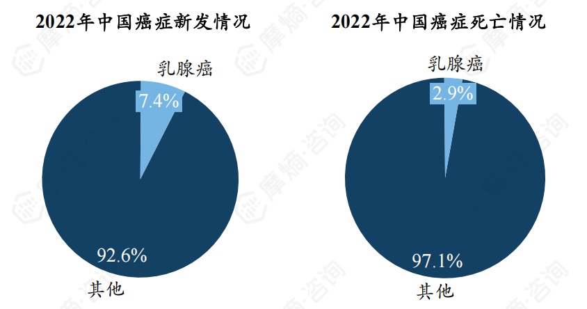 2022年我国癌症新发情况和死亡情况:新发病例数482.5万,其中乳腺癌35.7万人,位列我国全癌种发病人数第6位。2022年我国癌症死亡病例257.4万例,其中乳腺癌7.5万例,位列我国全癌种死亡例数第7位。