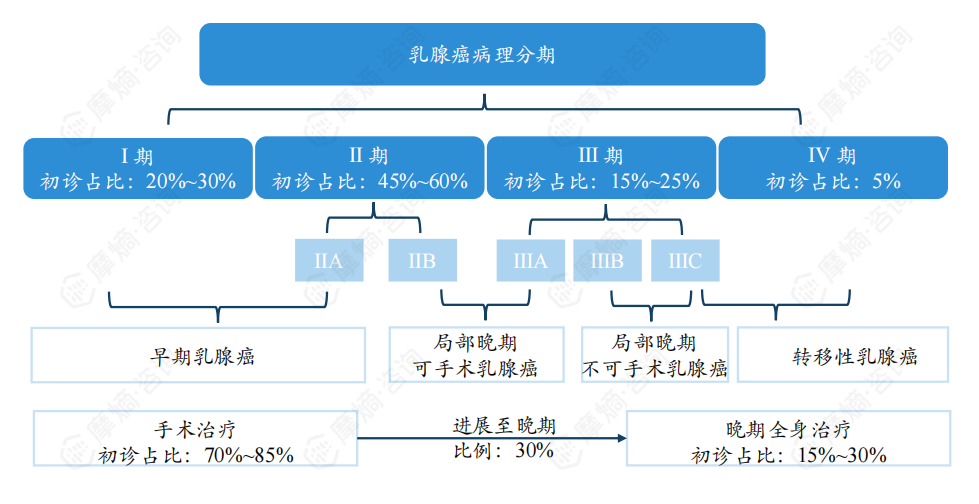 我国乳腺癌初诊Ⅰ-Ⅱ期患者比例约80%,早期以手术治疗为主,晚期需采取药物全身治疗。