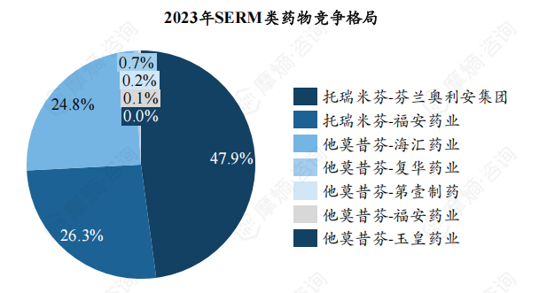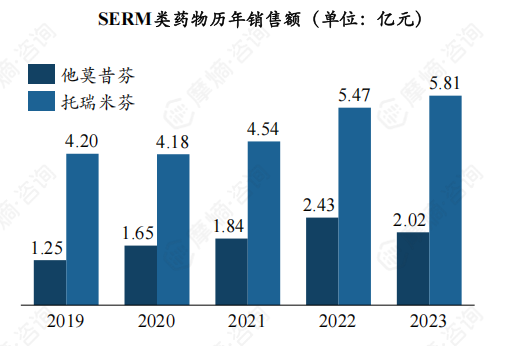 (2)SERM类药物市场竞争格局:托瑞米芬销售额逐年攀升,两款产品合计市占率超70%