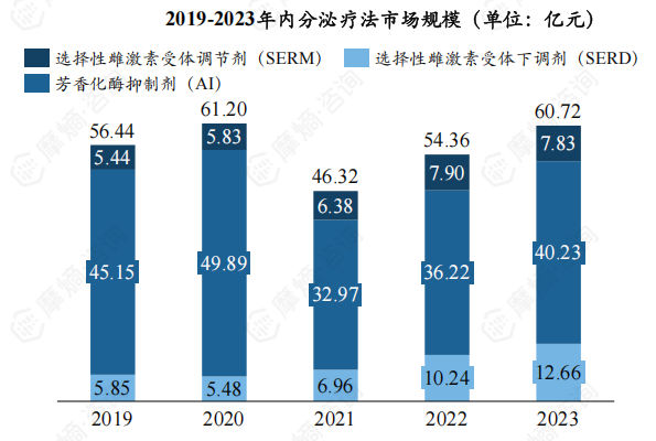 (1)内分泌疗法市场规模:内分泌疗法药物分为三大类,2023年市场规模超60亿元