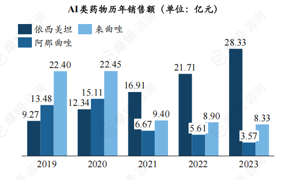 芳香化酶抑制剂类药物主要有来曲唑(诺华)、阿那曲唑(阿斯利康)和依西美坦(辉瑞),三款AI类药物在中国获批上市时间较早,目前市场上已有多款仿制产品。