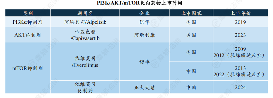 AKT抑制剂方面,目前阿斯利康的卡匹色替已于2023年10月在我国申报NDA;诺华的mTOR抑制剂依维莫司于2022年在我国获批乳腺癌适应症。