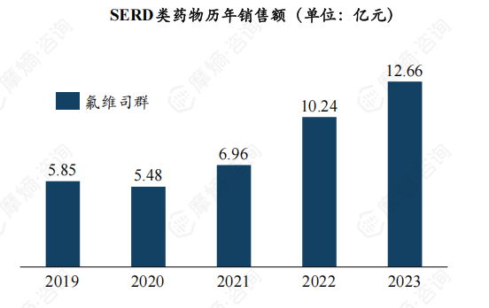 SERD类代表药物为氟维司群,用于未接受过内分泌治疗或辅助抗雌激素治疗期间或之后复发或疾病进展激素受体阳性局部晚期或转移性绝经后乳腺癌患者。氟维司群是目前国内唯一上市的SERD药物,相较于其他乳腺癌内分泌治疗,可以更全面地抑制雌激素受体的功能。