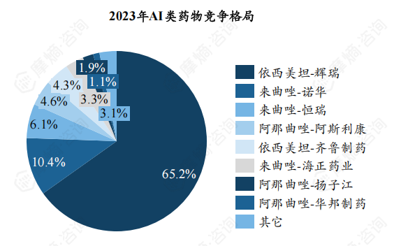根据摩熵医药销售数据库,2019-2023年来曲唑、阿那曲唑销售下滑趋势明显,主要原因为集采导致药品价格大幅下降;与之相反,依西美坦销售额增长趋势明显,2023年全国销售额达到28.33亿元。竞争格局方面,辉瑞依西美坦市占率达到65.2%,诺华来曲唑排名第二,市占率为10.4%,其余厂家市场份额较小。