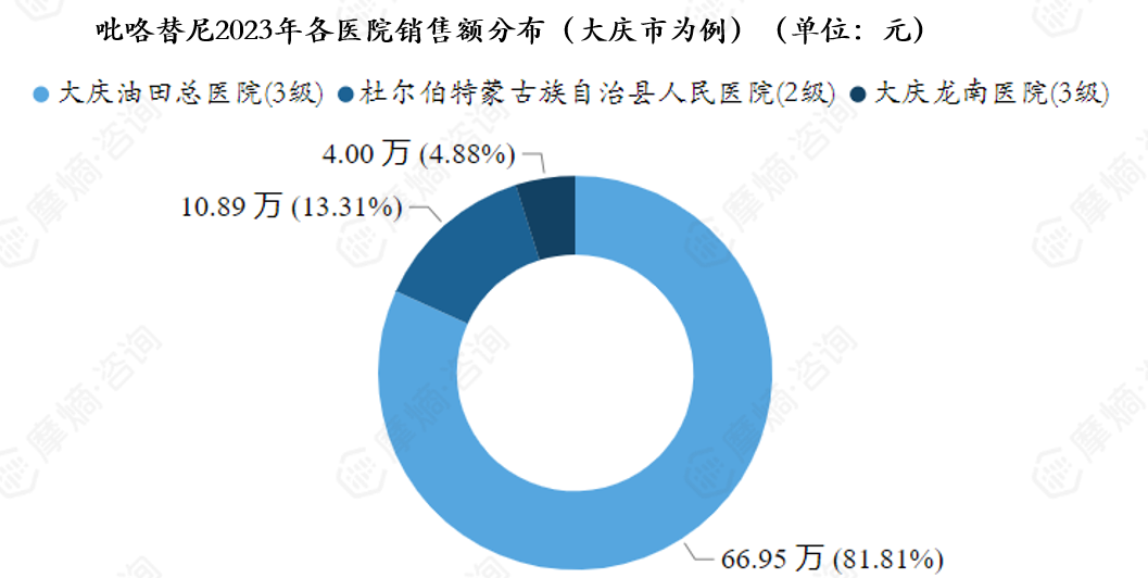 吡咯替尼2023年各医院(大庆市为例)销售额分布如下图,可以看出销售额波动较明显,其中大庆油田总医院销售额占比超过80%,位居第一。