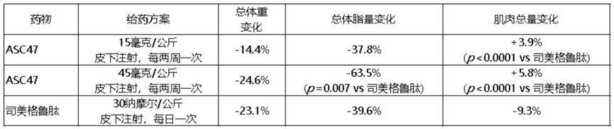 在一项与司美格鲁肽(semaglutide)进行头对头比较的DIO小鼠模型临床前研究中,ASC47治疗组DIO小鼠总体脂量减少(-63.5%),与司美格鲁肽(-39.6%)相比,具有统计学显著性。在同一项研究中,ASC47治疗组DIO小鼠肌肉总量统计学显著性增加(+5.8%),而司美格鲁肽治疗组DIO小鼠肌肉总量减少(-9.3%)。