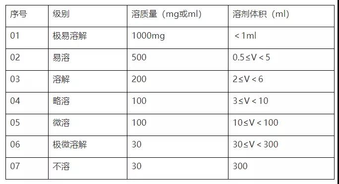 ⑦几乎不溶或不溶:溶质1g(ml)在溶剂10000ml中不能完全溶解;