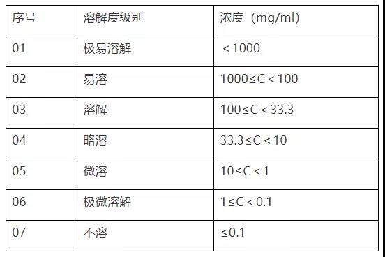 ⑥极微溶解:溶质1g(ml)能在溶剂不到1000~不到10000ml中溶解;