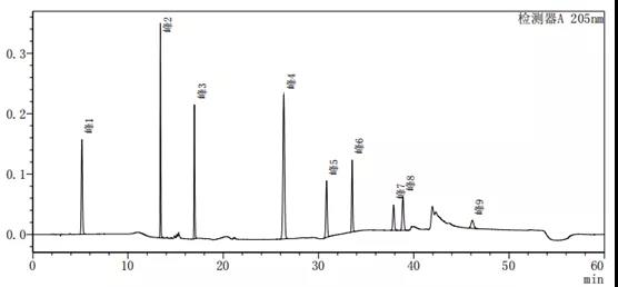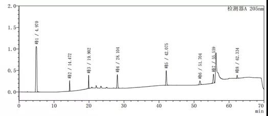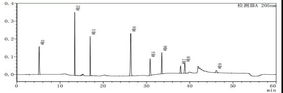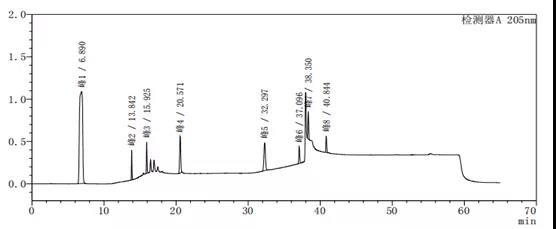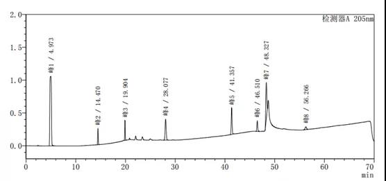 通过上述图谱、梯度洗脱程序的比较可以看出,缓慢的加入有机相可以使梯度峰更加平滑,使各杂质峰的分离度更好。