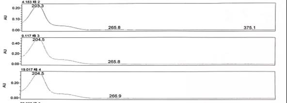 以上述图谱中三个杂质为例,可以看出3个杂质的最大吸收分别为203.3、204.5、204.5nm,同时在205~230nm这个范围内也可以作为次选波长。所以综合考虑该三个杂质的检测波长可以暂定为205nm。