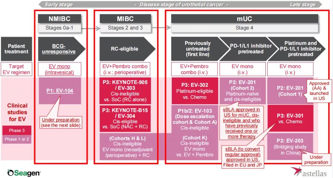 转移性尿路上皮癌——PADCEV(enfortumab vedotin-ejfv)是一款first-in-class抗体偶联药物(ADC),靶向在膀胱癌中高度表达的一种细胞表面蛋白Nectin-4,2019年12月获美国FDA加速批准,用于治疗局部晚期或转移性尿路上皮癌患者,该药由安斯泰来与Seagen合作开发。2021年7月11日,安斯泰来与Seagen宣布Padcev获得了FDA常规批准。同时,Padcev还扩展了适应症标签,用于曾接受过PD-1/PD-L1抑制剂治疗且不符合顺铂治疗的局部晚期或转移性尿路上皮癌患者。