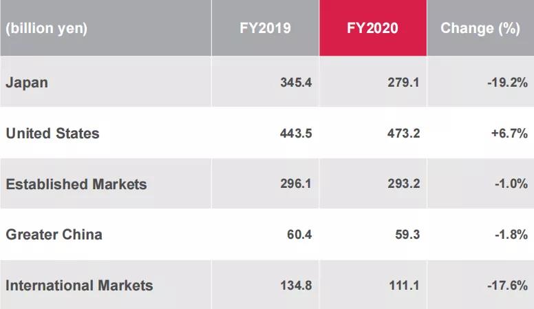 按地区分,2020财年公司在日本的业绩为2791亿日元(约25.6亿美元),同比减少19.2%;在美国的业绩为4732亿日元(约43.4亿美元),同比增长6.7%;在成熟市场的业绩为2932亿日元(约26.9亿美元),同比减少1%;在大中华地区的业绩为593亿日元(约5.4亿美元),同比减少1.8%;国际市场的业绩为1111亿日元(约10.2亿美元),同比减少17.6%。