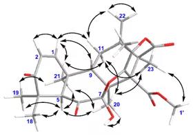 JNP(Journalof Natural Products)杂志近期发表的某新的萜类化合物1的平面结构推断见图1,红色箭头表示的是根据HMBC谱推断的碳氢相关性,蓝色粗线表示的是1H-1H COSY谱推断的氢氢相关性。该化合物平面结构确证后,其相对构型通过NOESY谱进行确定,NOESY谱上可反映空间上的氢氢相关性,见图2,黑色箭头标出了空间氢原子相关。详细的解析过程和核磁共振图谱数据可查询参考文献[5]。