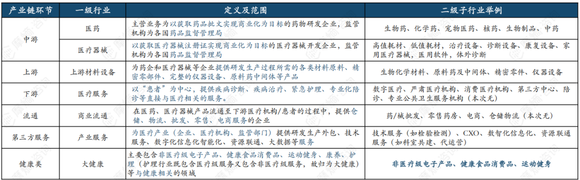 按照产业链环节及分工、所提供的产品/服务特点、服务对象,可将医疗健康领域分为医药、医疗器械、上游材料设备、医疗服务、商业流通、产业服务、大健康7个行业,分类依据及行业范围详见下表: