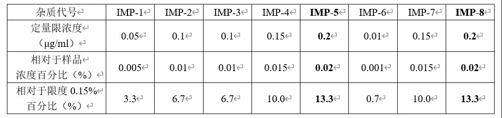3、根据定量限考察结果,8个杂质中灵敏度最差的为IMP-5与IMP-8。那么回收率加标水平除了常规的低、中、高三个点设计外,各个杂质更低水平的加标浓度可以统一设置为15%~20%即可。