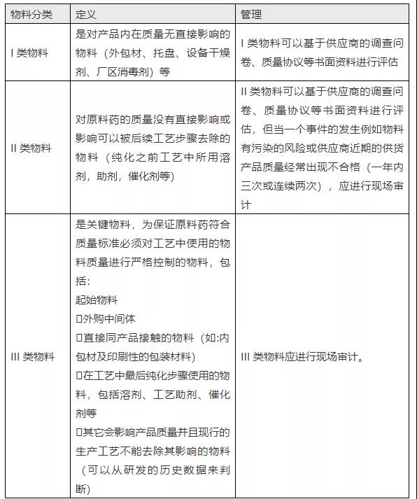 “企业应基于对工艺的了解科学合理地定义哪些物料是关键物料(应在文件中体现),通常可以考虑将物料按照对于产品质量影响程度分为三个类别:I,II 和III类