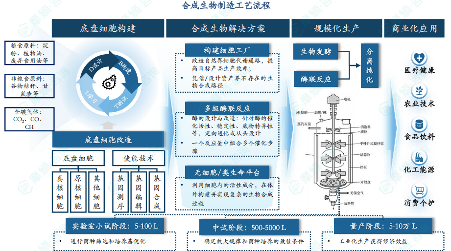合成生物学从实验室研发到产业化落地,需经过细胞构建、生产规模放大两个阶段。