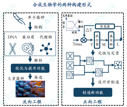 (2)自下而上(正向工程):通过将“非生命”生物分子成分聚集在一起在体外创建新的生物系统,元件标准化→模块构建→底盘适配的线路以及对生命过程的途径、网络组成及其调控、设计与构建是核心内容,人工线路构建平台是其关键技术。